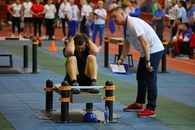 Поднимание туловища из положения лежа на спине выполняется из исходного положения: лежа на спине, на гимнастическом мате, руки за головой «в замок», лопатки касаются мата, ноги согнуты в коленях под прямым углом, ступни прижаты партнером