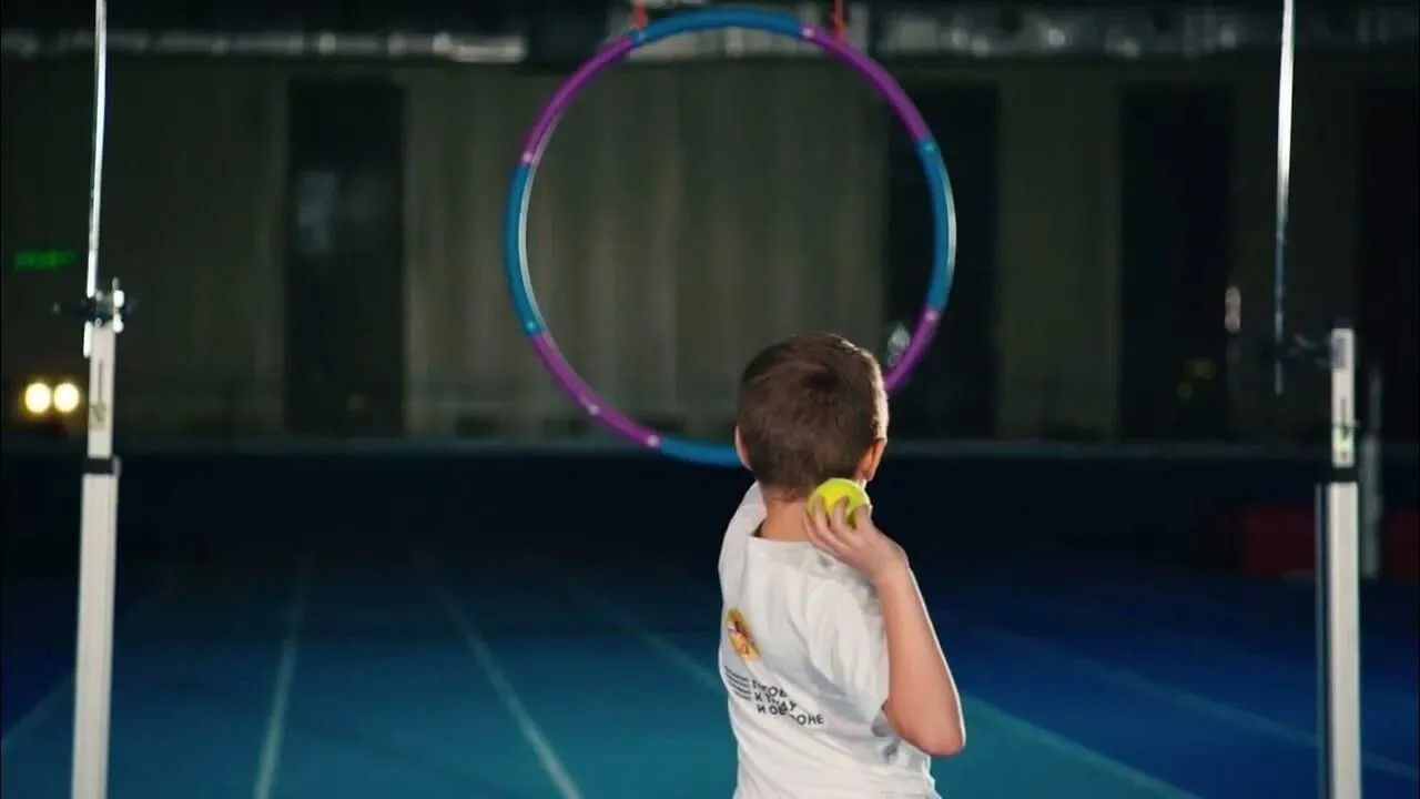 Метание теннисного мяча в цель производится с расстояния 6 (II ступень ГТО) метров в закрепленный на стене гимнастический обруч диаметром 90 см. Нижний край обруча находится на высоте 2 метра от пола. Для метания теннисного мяча в цель используется мяч весом 57 грамм.