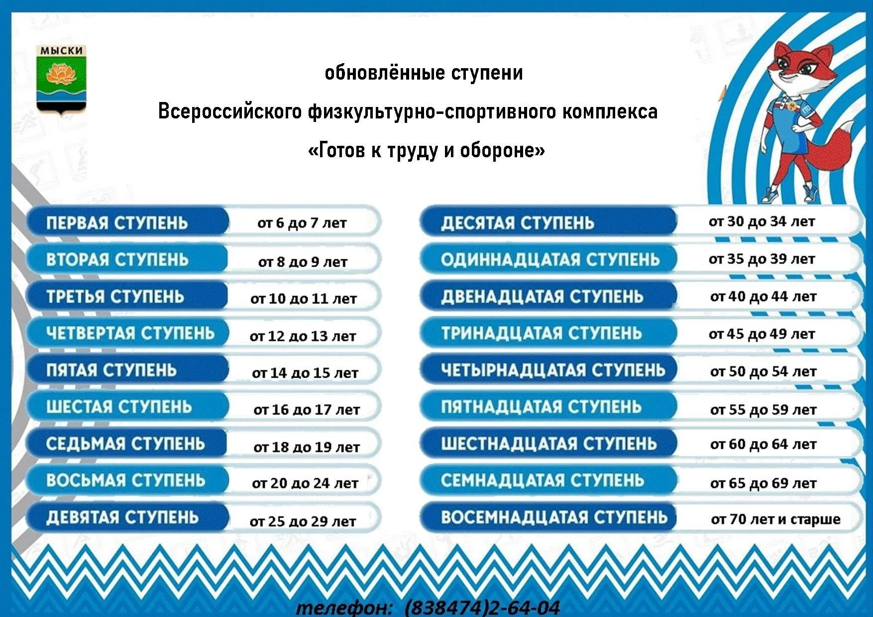 На данный момент комплекс ГТО состоит из 18 ступеней в соответствии с возрастными группами населения от 6 лет (I ступень) до 70 лет и старше (XVIII ступень) и нормативов по 3 уровням трудности, соответствующих золотому серебряному и бронзовому знакам отличия.