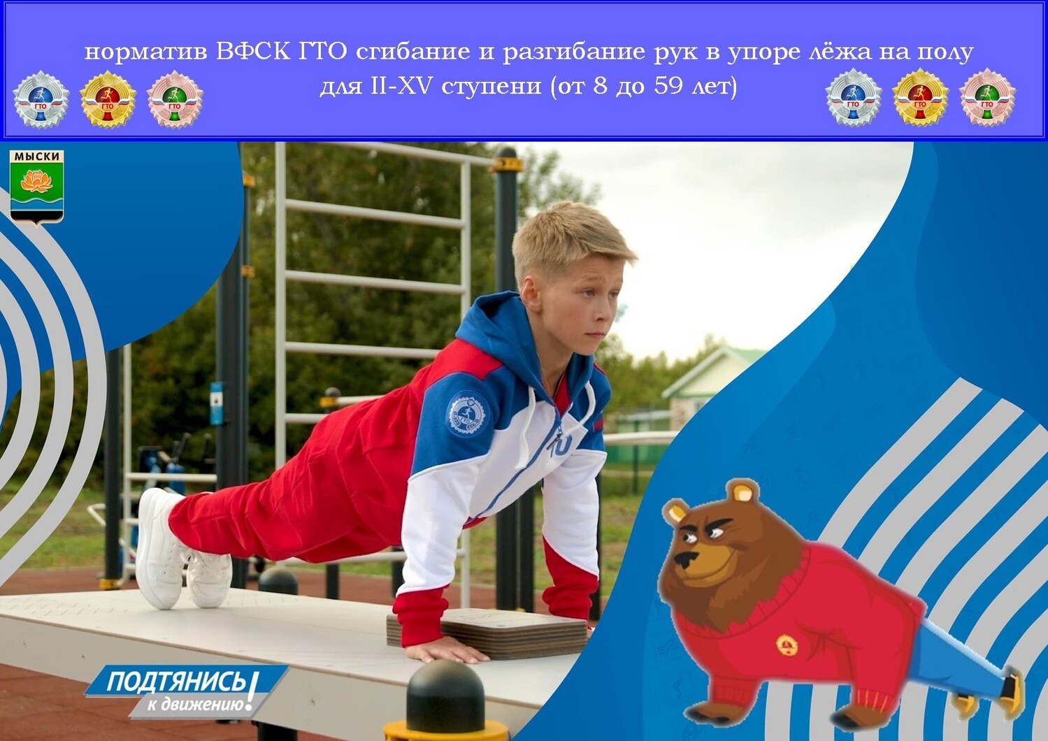 Сгибание и разгибание рук в упоре лежа на полу является одним из испытаний, входящих в комплекс Готов к Труду и Обороне (ГТО). Это испытание могут проходить участники II-ХV ступеней, в возрасте от 8 до 59 лет. < ... Читать дальше »