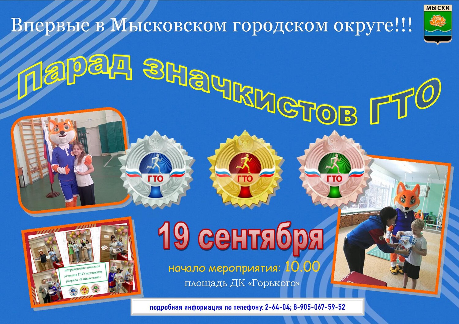 19 сентября в Мысковском городском округе впервые в Кемеровской области состоится парад значкистов Всероссийского физкультурно-спортивного комплекса «Готов к труду и обороне» (ГТО)!