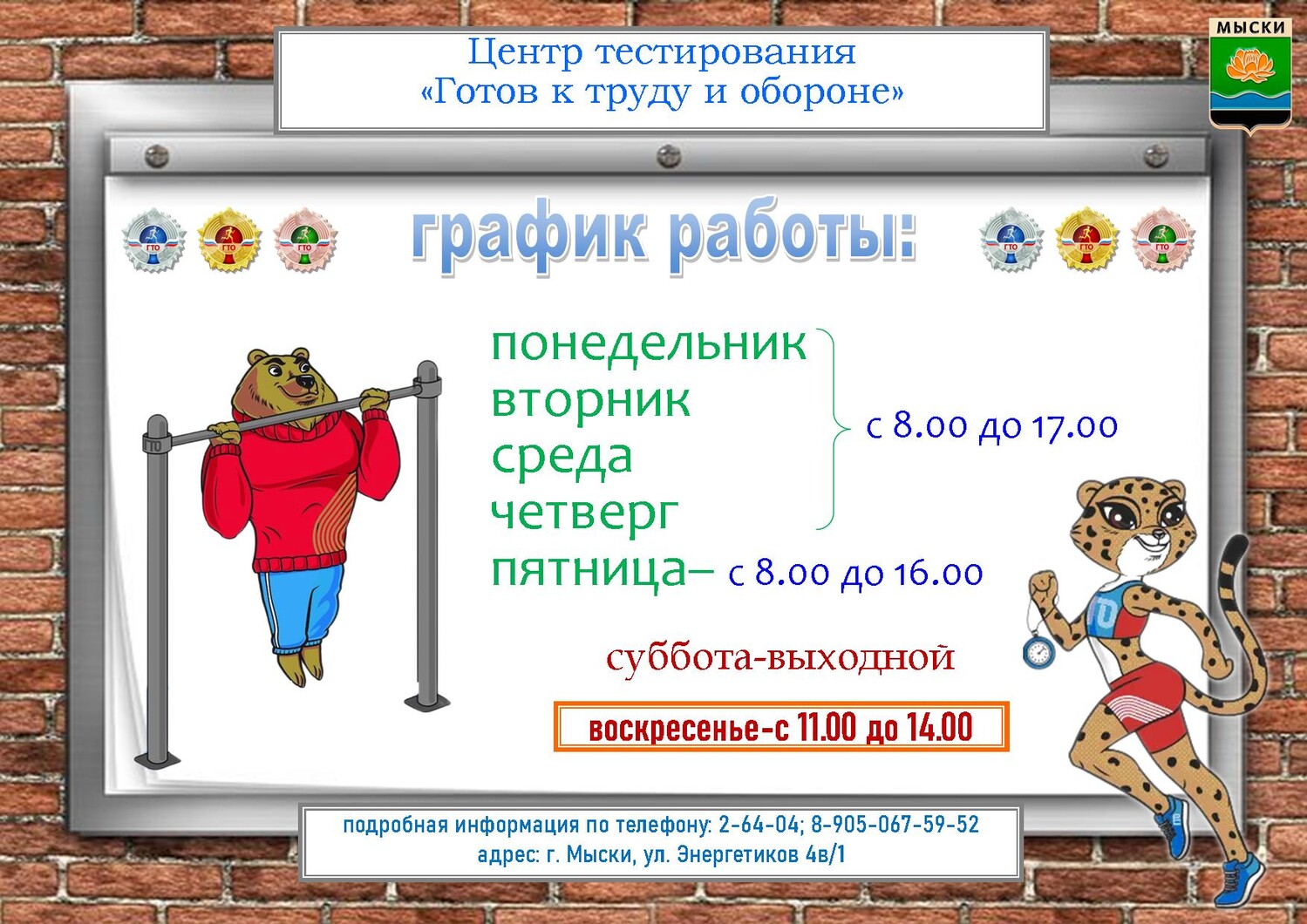 Центр тестирования «Готов к труду и обороне» рад сообщить об изменении графика работы! Теперь у вас появилась новая возможность проверить свои силы — мы возобновляем работу в выходной день! Не упустите шанс присоединиться к движению ГТО! Ждём вас! Подробную информацию о порядке выполнения нормативов ГТО, расписании работы центра тестирования и необходимых документах вы можете получить по | |
